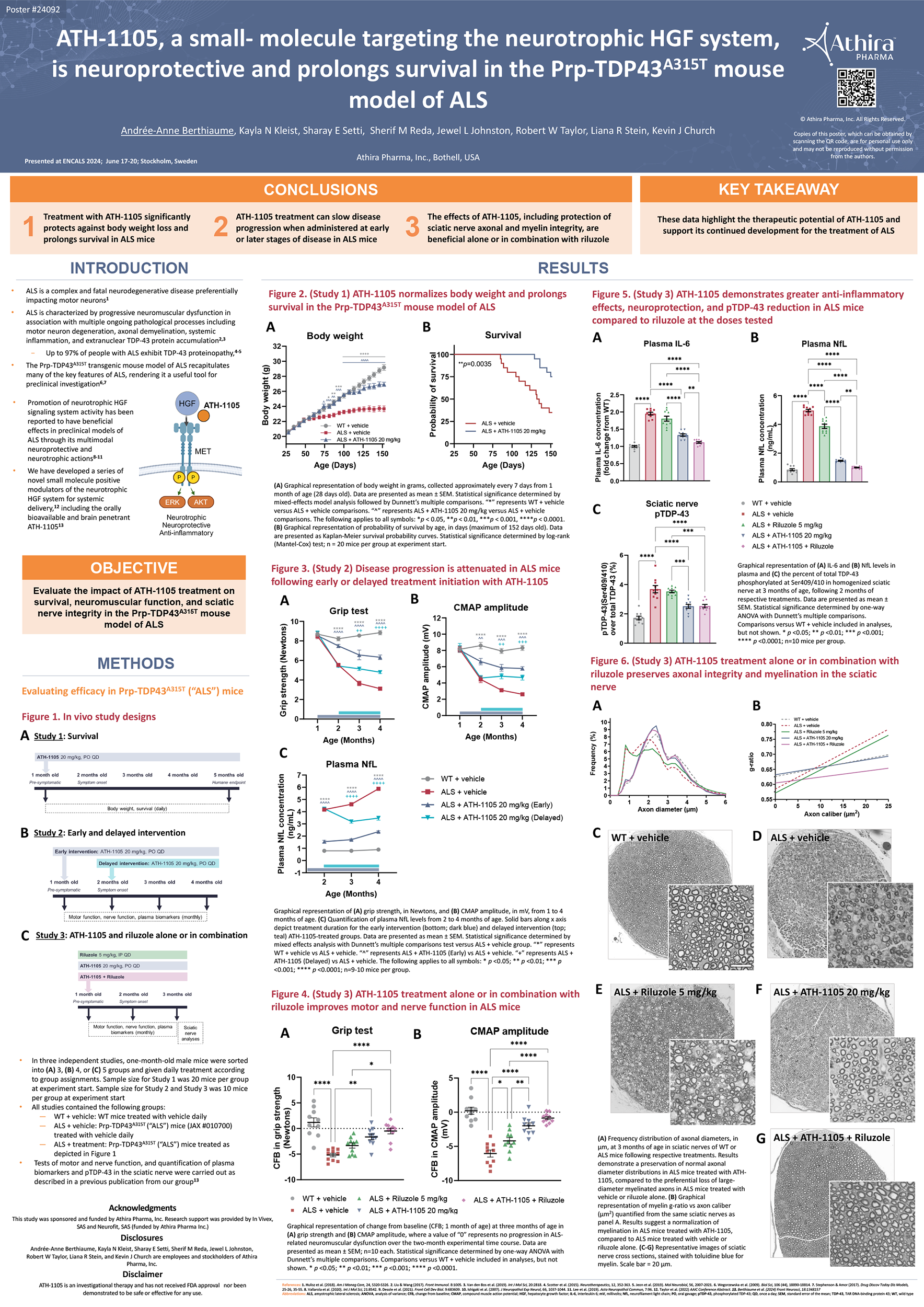 Medical Affairs Scientific Publications and Presentations LasofoxifeneATH-1105 Lasofoxifene Publications November 1, 2024 ELAINE 3: phase 3 study of lasofoxifene plus abemaciclib to treat ER+/HER2-, ESR1-mutated, metastatic breast cancer December 7, 2023 Lasofoxifene versus fulvestrant for ER+/HER2− metastatic breast cancer with an ESR1 mutation: results from the randomized, phase II ELAINE 1 trial December 7, 2023 Open-label, phase II, multicenter study of lasofoxifene plus abemaciclib for treating women with metastatic ER+/HER2− breast cancer and an ESR1 mutation after disease progression on prior therapies: ELAINE 2 May 12, 2021 Lasofoxifene as a potential treatment for therapy-resistant ER-positive metastatic breast cancer July 2, 2020 The Dysregulated Pharmacology of Clinically Relevant ESR1 Mutants is Normalized by Ligand-activated WT Receptor February 25, 2010 Lasofoxifene in Postmenopausal Women with Osteoporosis Lasofoxifene Presentations No presentations available at this time ATH-1105 Publications January 7, 2026 ATH-1105 mitigates multiple pathologies in ALS models both alone and in combination with riluzole February 7, 2024 ATH-1105, a small-molecule positive modulator of the neurotrophic HGF system, is neuroprotective, preserves neuromotor function, and extends survival in preclinical models of ALS ATH-1105 Presentations January 7, 2026 ATH-1105, a small-molecule positive modulator of the neurotrophic HGF system, attenuates TDP-43 pathology in preclinical models of ALS June 17, 2024 ATH-1105, a small- molecule targeting the neurotrophic HGF system, is neuroprotective and prolongs survival in the Prp-TDP43A315T mouse model of ALS